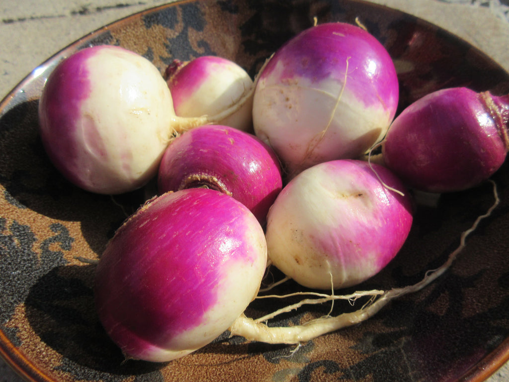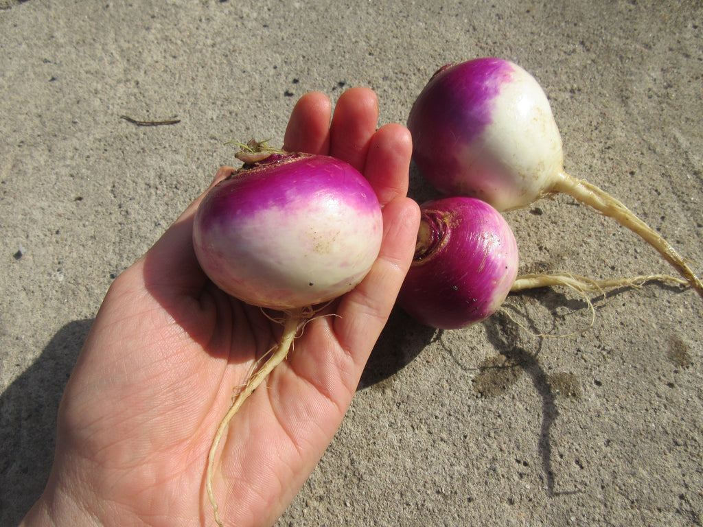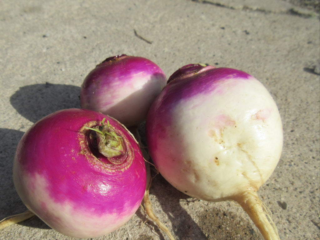 An heirloom variety originating from Berlin, this beautiful early turnip has a delicate and delicious flesh. It grows quickly and is very hardy. These turnips remain tender even when they become large (and they can get enormous!). Delicious mashed, roasted, or in soups, which bring out their sweet aromas.